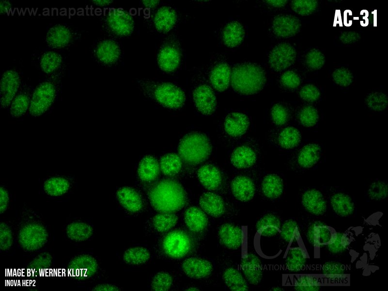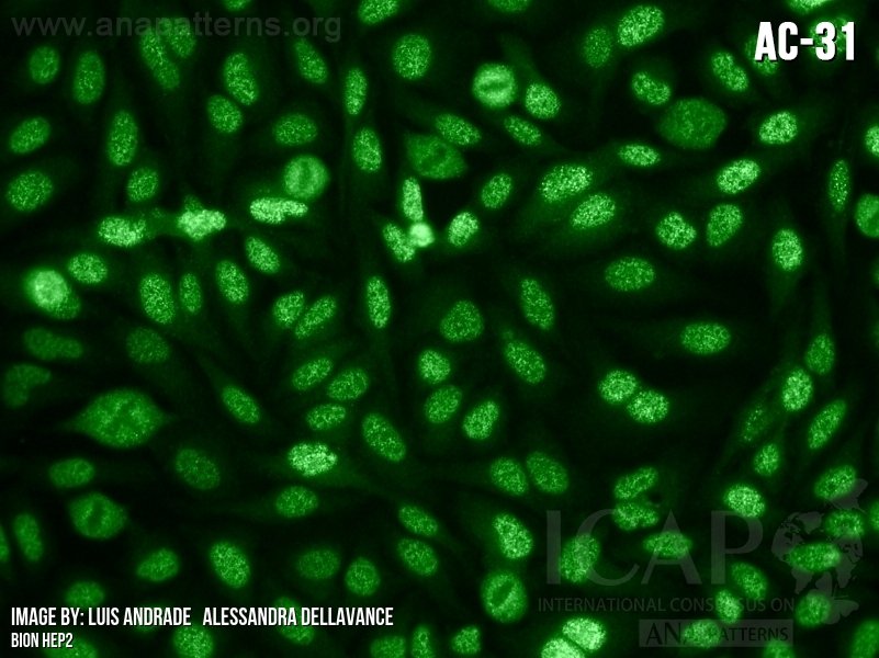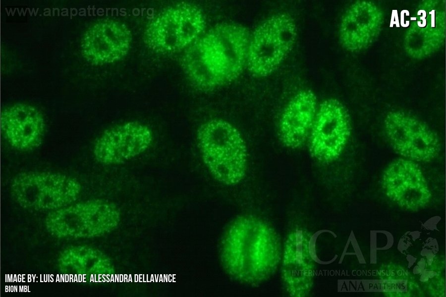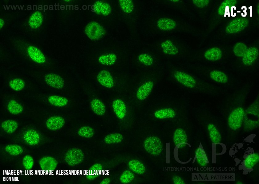 ▶ Because of the strong association with anti-TROVE2/Ro60 antibodies, the AC-31 pattern is frequently seen in patients with systemic lupus erythematosus (SLE) and Sjögren’s disease (SjD). It is not commonly observed in healthy individuals, as opposed to the AC-4 plain fine speckled nuclear pattern that is one of the most frequent HEp-2 IFA patterns in asymptomatic individuals and patients with no systemic autoimmune disease. |