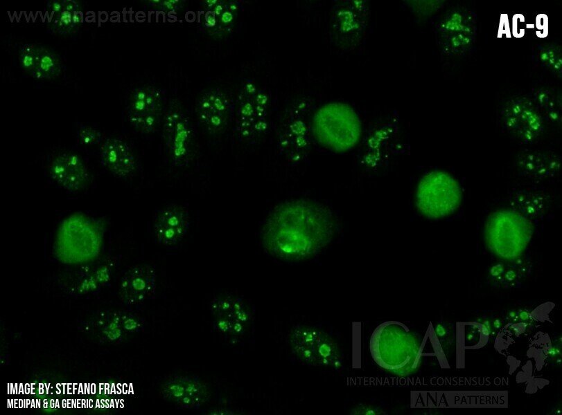 ▶ Found in patients with SSc (48) ▶ If SSc is clinically suspected, it is recommended to perform a follow-up test for anti-U3RNP/fibrillarin antibodies; the antigen is included in disease specific immunoassays (i.e., SSc profile*) (48) ▶ If confirmed as anti-U3RNP/fibrillarin reactivity by immunoassay, the clinical association is with diffuse SSc, increased incidence of pulmonary arterial hypertension, skeletal muscle disease, severe cardiac involvement, and gastrointestinal dysmotility (23, 48–50) ▶ Among SSc patients, anti-U3RNP/fibrillarin antibodies are most commonly found in African American and Latin American patients (48, 49, 51) Notes: Although some anti-U3RNP/fibrillarin immunoassays are commercially available, technical issues relating to the limited sensitivity of these immunoassays should be taken into consideration (24). *Availability of the inflammatory myopathy profile, the SSc profile and the (extended) liver profile may be limited to specialty clinical laboratories. |