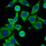 Staining of microtubules and intermediate filaments spreading from the nuclear rim. e.g. anti-cytokeratin, anti-vimentin.