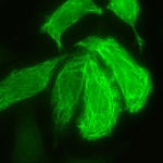 This pattern is characterized by decorated cytoskeletal fibers, sometimes with small, discontinuous granular deposits. Typical staining show striated actin cables spanning the long axis of the cells. e.g. anti-actin, anti-non-muscle myosin.