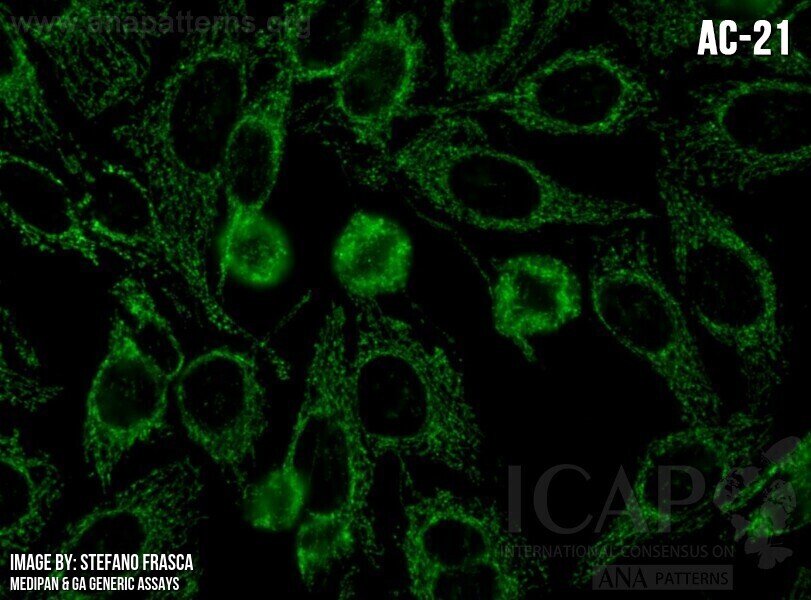 ▶ Commonly found in primary biliary cholangitis (PBC), but also detected in systemic sclerosis (SSc), including PBC-SSc overlap syndrome and PBC-Sjögren’s disease (SjD) overlap syndrome, and in other systemic autoimmune rheumatic diseases [1-7]. ▶ If PBC is clinically suspected, a follow-up test for AMA is recommended, historically detected by IFA on rodent tissue (liver, stomach, kidney) and using disease specific immunoassays (i.e., liver profile) as well as in some routine multianalyte arrays. |