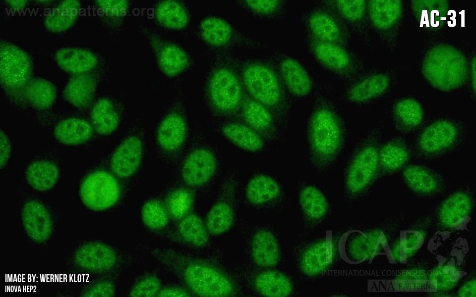 ▶ Because of the strong association with anti-TROVE2/Ro60 antibodies, the AC-31 pattern is frequently seen in patients with systemic lupus erythematosus (SLE) and Sjögren’s disease (SjD). It is not commonly observed in healthy individuals, as opposed to the AC-4 plain fine speckled nuclear pattern that is one of the most frequent HEp-2 IFA patterns in asymptomatic individuals and patients with no systemic autoimmune disease. |